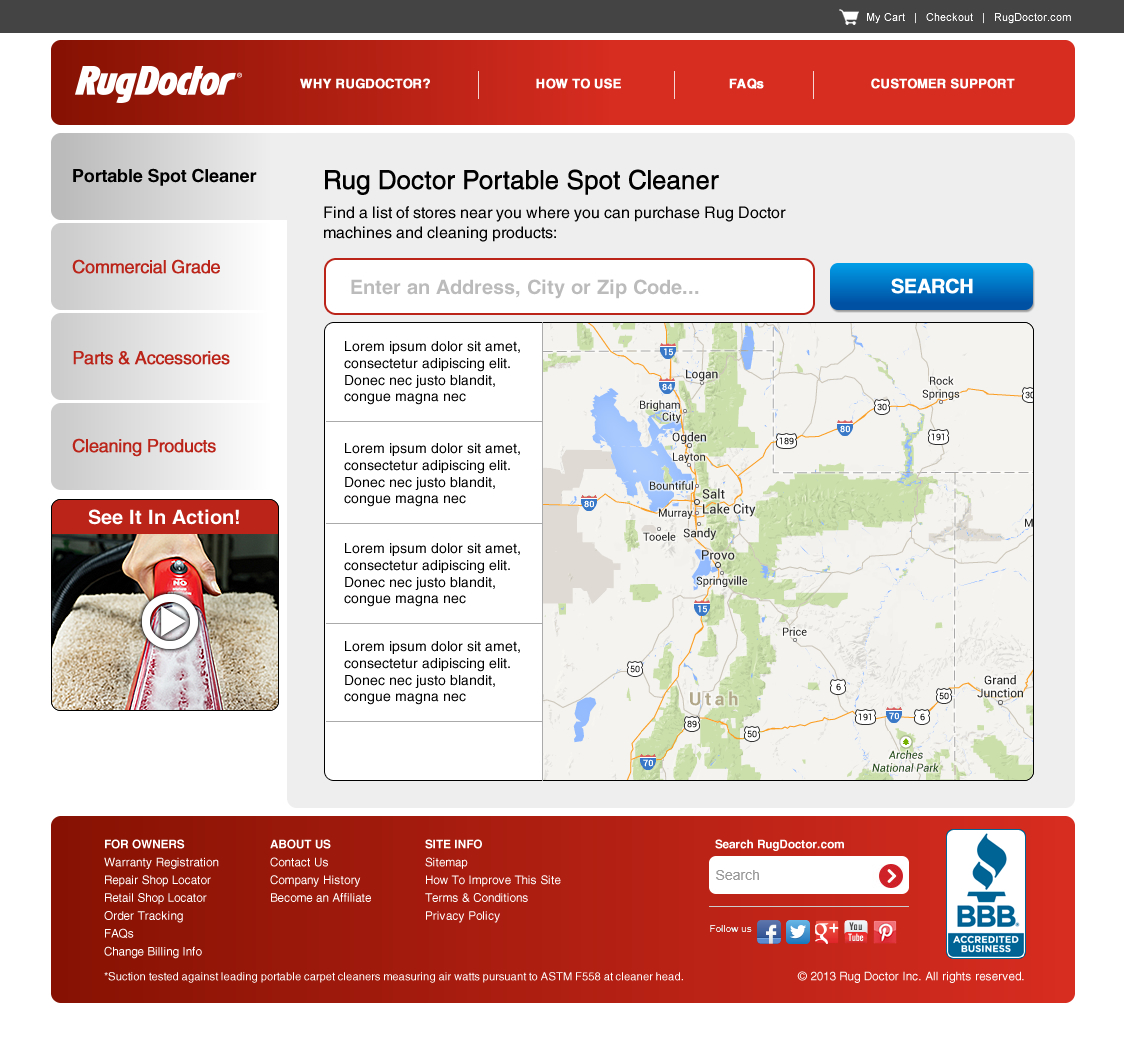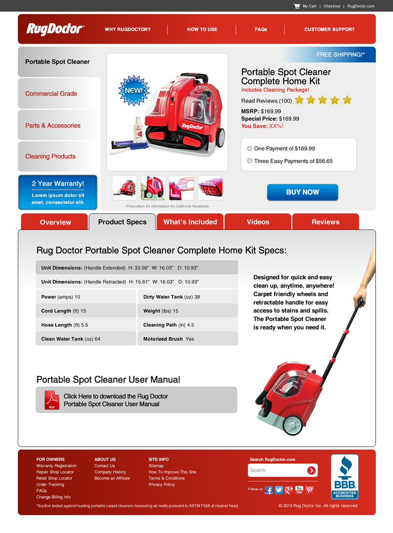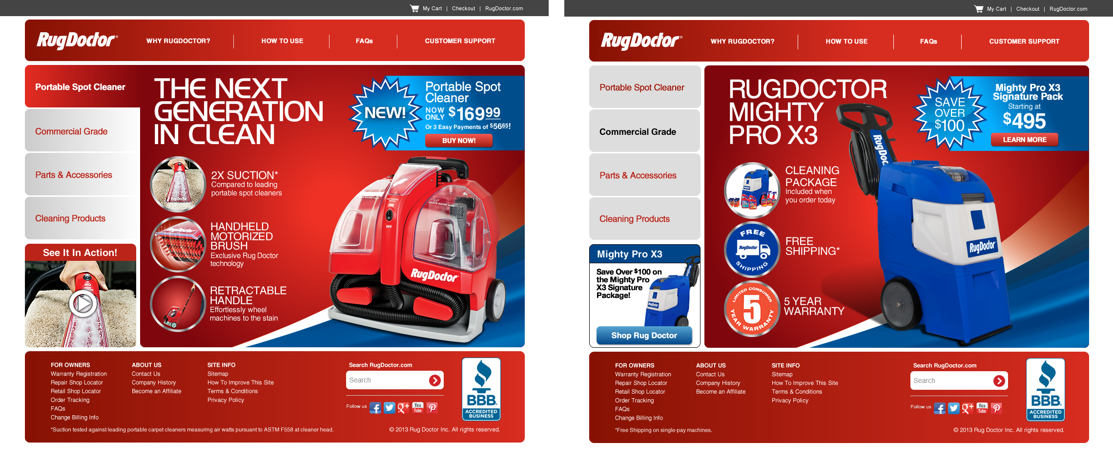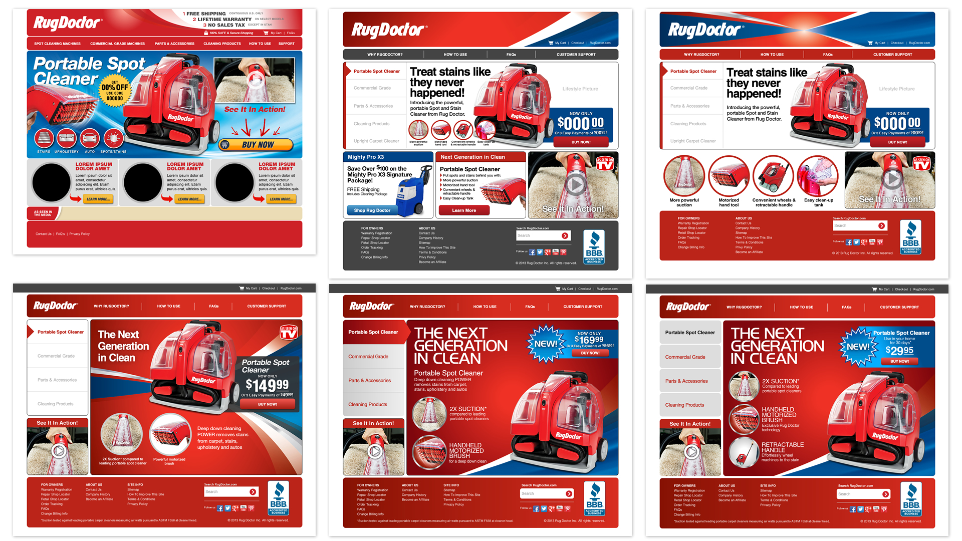 Leave your thoughtsRugDoctor was looking to re-brand it’s blue Buy RugDoctor site… not enough red they said. They love red, and now, by golly, it shows. They wanted the rounded corner look with a blue swoosh red radial background that is used in their newer packaging. Plus a Star Trek-ky font and twice the landing page variations shown here.